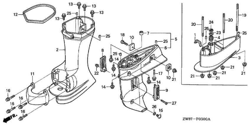 Модификация Вашего двигателя: Honda BF8D3 LHSC Вернуться к выбору узлов мотора Картер коробки передач / Удлинение корпуса |