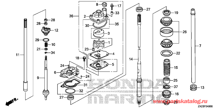 Модификация Вашего двигателя: Honda BF250A XU Вернуться к выбору узлов мотора F-04 Водяной насос / Вертикальный вал |