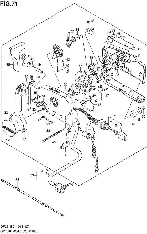 Подобрать оригинальные запчасти на лодочный подвесной мотор Suzuki DF25S/L; DF25RS/L; DF25QS/L; DF25TS/L модель 2013 года - Опции: дистанционное управление / Opt:remote control