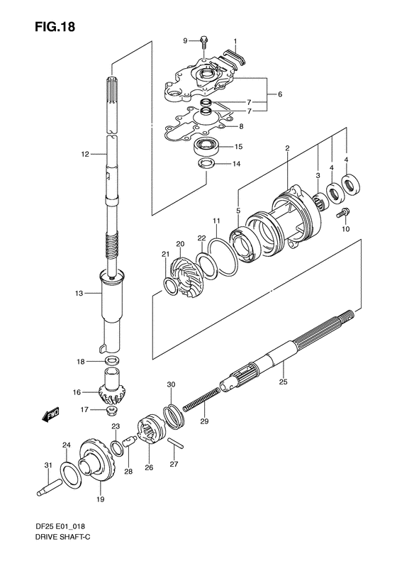 Купить комплектующие на подвесной двигатель SUZUKI DF25S/L; DF25RS/L; DF25QS/L; DF25TS/L модель 2007 года - Drive shaft