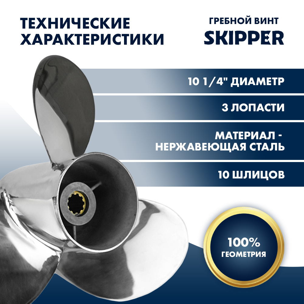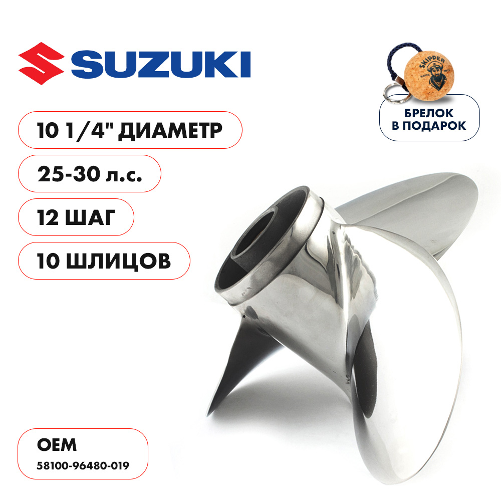 Полный код запчасти: SK58100-96480-019-SS (SK5810096480019SS) Наименование запчасти: Винт гребной Skipper для Suzuki 25-30HP, диаметр 10 1/4" нержавеющий, лопастей - 3, шаг 12" Описание запчасти: Трехлопастной гребной винт из нержавеющей стали с резиновой втулкой амортизатором для подвесных лодочных моторов Suzuki мощностью 25-30 л.с.